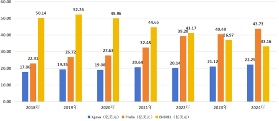 生物类似药的竞争之下,安进核心产品TNF抑制剂ENBREL的市场份额不断下滑,这也使得Prolia与Xgeva成为安进过去5年营收持续增长的核心支柱。2024年中,Prolia与Xgeva累计贡献营收65.99亿美元,在安进总营收中的占比超过20%。