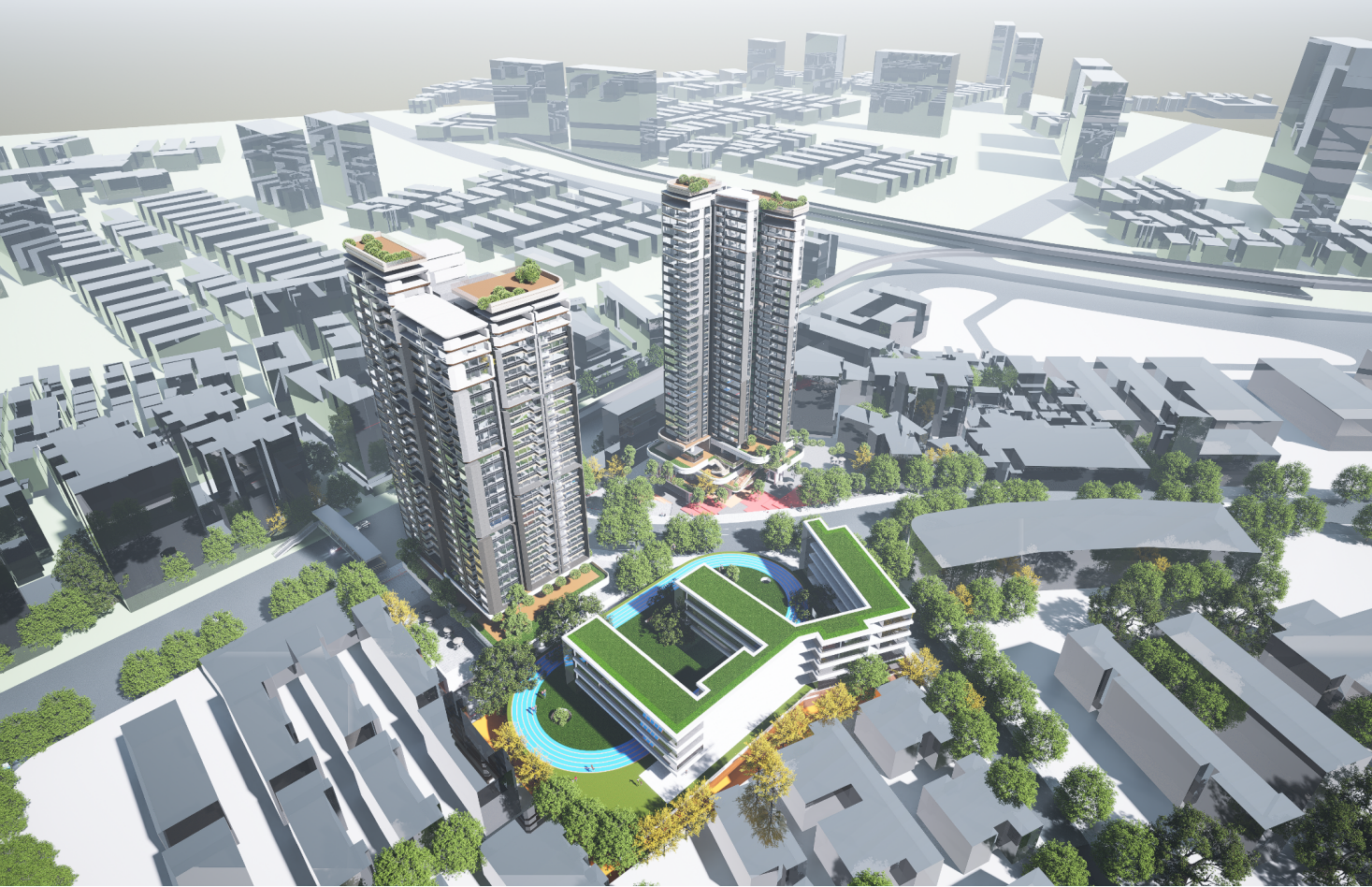 得胜岗片区方案整合现状21栋多层建筑基底用地,和无主用地,新建2栋高层塔楼,降低建筑密度、提高绿地率水平,提升人居环境。改造后,居住面积减少0.46公顷,主要用于增加中小学用地0.2公顷,以及道路面积0.26公顷,实现土地集约化利用、优化城市空间形态。